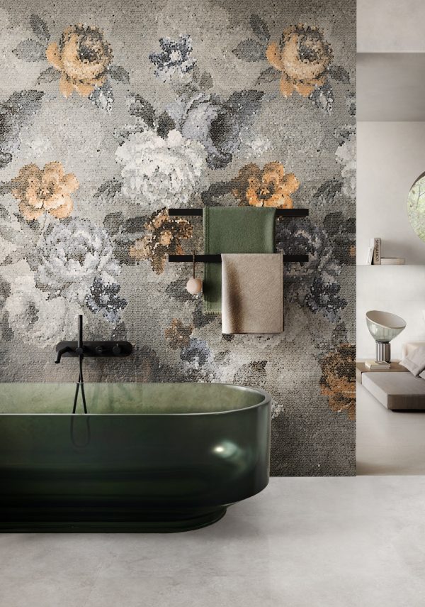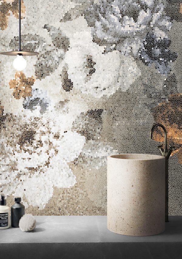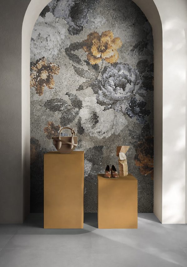 GAIA is a tribute to Mother Earth as an eternal muse, blending floral romance with pixel-art mosaic aesthetics. This surface combines classic botanical illustrations with a digital edge—each flower formed by thousands of tiny tesserae, creating a textured visual symphony that merges art, nature, and technology. GAIA turns any wall into a poetic mural, rich in both craft and narrative.